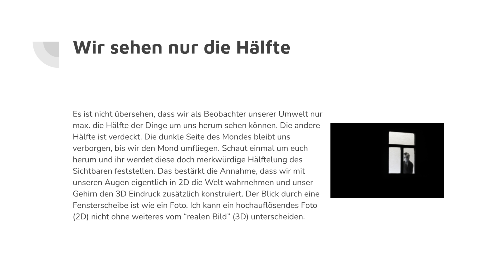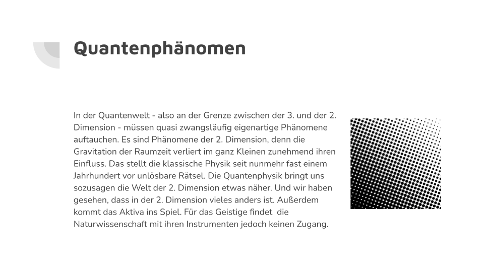 Dieses Buch ist ein Versuch, die 2. Dimension als unsichtbaren Ausgangspunkt für den sichtbaren Kosmos bzw. Raumzeit zu beschreiben. In diesem Ansatz wird über die Differenz AKTIVA und PASSIVA an ein – an Giordano Bruno angelegtes – ordnungsbildendes Wirken angeknüpft, ohne allerdings einen allmächtigen Gott auf den Plan zu rufen. Der Kosmos, das Leben und die menschlichen Errungenschaften und hier insbesondere die Verwendung der Mathematik sind ohne das, was wir Geist nennen, nicht mehr abschließend beschreibbar. Die anhaltende Krise der theoretischen Physik ist ein deutlicher Hinweis, dass ein reduktionistischer Ansatz nicht mehr weiterführt. Sie hat sich mit der Entdeckung der Quantenmechanik selbst in die Verzweiflung geführt. Große Physiker des letzten Jahrhunderts, wie bspw. Einstein und Heisenberg haben an der Vereinigung der Relativitätstheorie mit der Quantenmechanik (kurz die Quantengravitation) gearbeitet, ohne jedoch eine Lösung zu finden. Die mathematisch orientierte Stringtheorie war lange eine große Hoffnungsträgerin, aber sie steckt ebenfalls fest.
