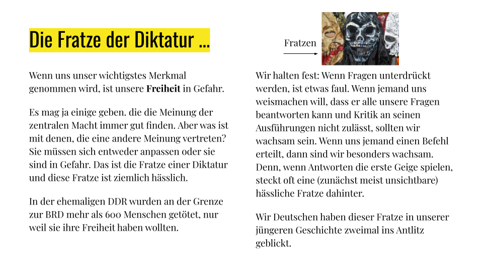 Es war ein Zufall, dass das Cover des Buches in den Farben der Ukraine illustriert ist. Gerade steht für Europa das Fragezeichen auf dem Spiel. Es soll durch das Ausrufezeichen – das Zeichen der Diktatur – abgelöst werden. Die Fratze der Diktatur zeigt sich einmal mehr. Die Freiheit ist das höchste Menschenrecht jeder demokratischen Gesellschaft. Sie steht auch in unseren Grundgesetz in Art. 2 (1) GG noch vor dem Menschenrecht auf Leben Art. 2 (2) GG. Wer die Freiheit einmal kennengelernt hat, ist bereit – und das zeigt soeben das ukrainische Volk – dafür sein Leben einzusetzen.